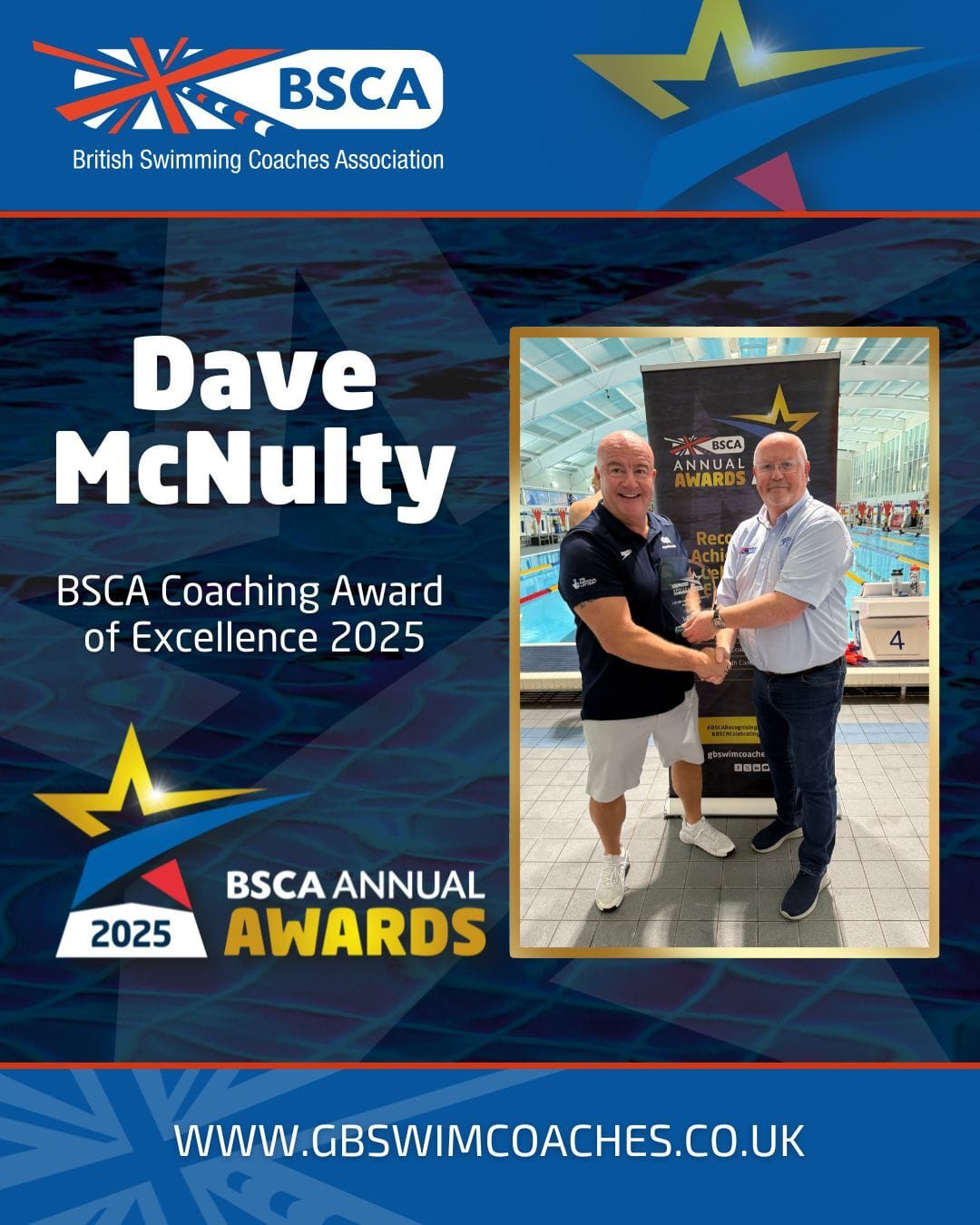 McNulty (Aquatics GB Bath NPC), one of Britain's most successful coaches ever, was awarded a BSCA Coaching Award of Excellence 2025 for the part he played as coach to members of the GB Team who retained the World Championship Men’s 4x200 free at the World Championships.