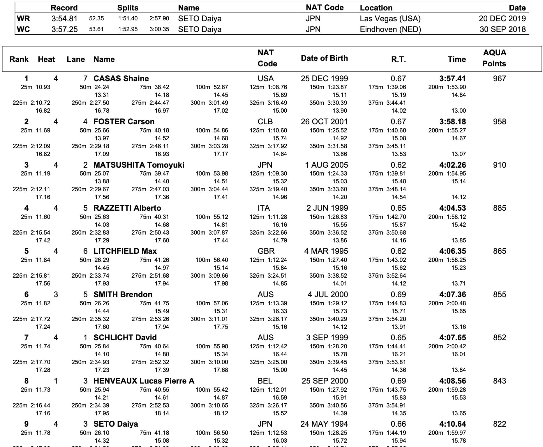 Casas was challenged by Carson Foster, another Longhorns medley ace and training partner of France's four-times Olympic champion in Paris last year, Léon Marchand. Foster's 3:58.18 was the last sub-4mins effort, Japan's Tomoyuki Matsushita win 4:02.28 for third place.