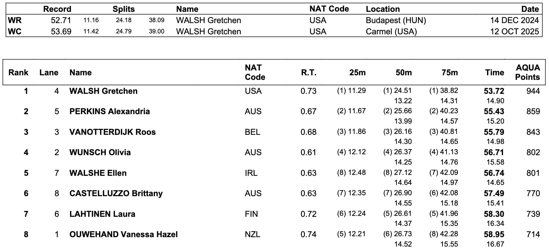 So ahead of the curve of her peers is Gretchen Walsh on sprint butterfly right now that a 53.72 that left her 1.02sec shy of her own World record in the 100m today delivered victory by almost 2sec over Australian Alexandria Perkins, Belgium's Roos Vanotterdijk third just over 2sec behind the winning American.