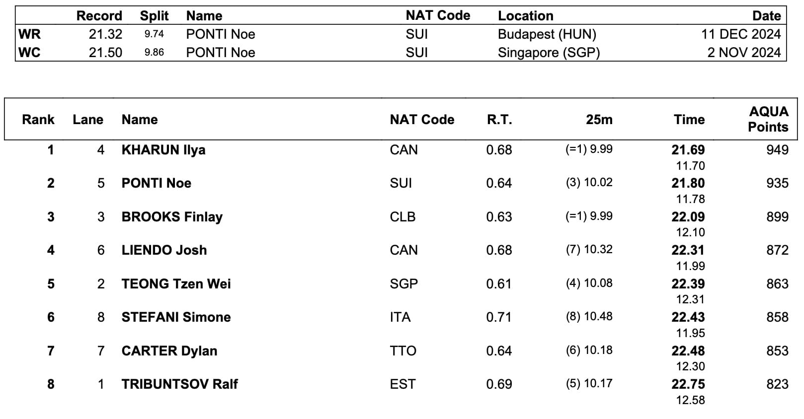 Also just shy off the 950-points mark, Ilya Kharun, of Canada, pipped World record holder Noe Ponti, of Switzerland 21.69 to 21.80 in the 50m 'fly: