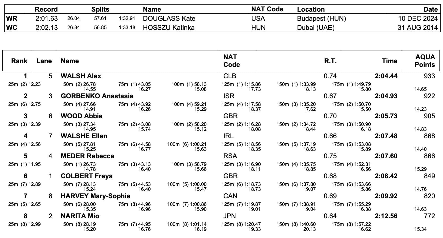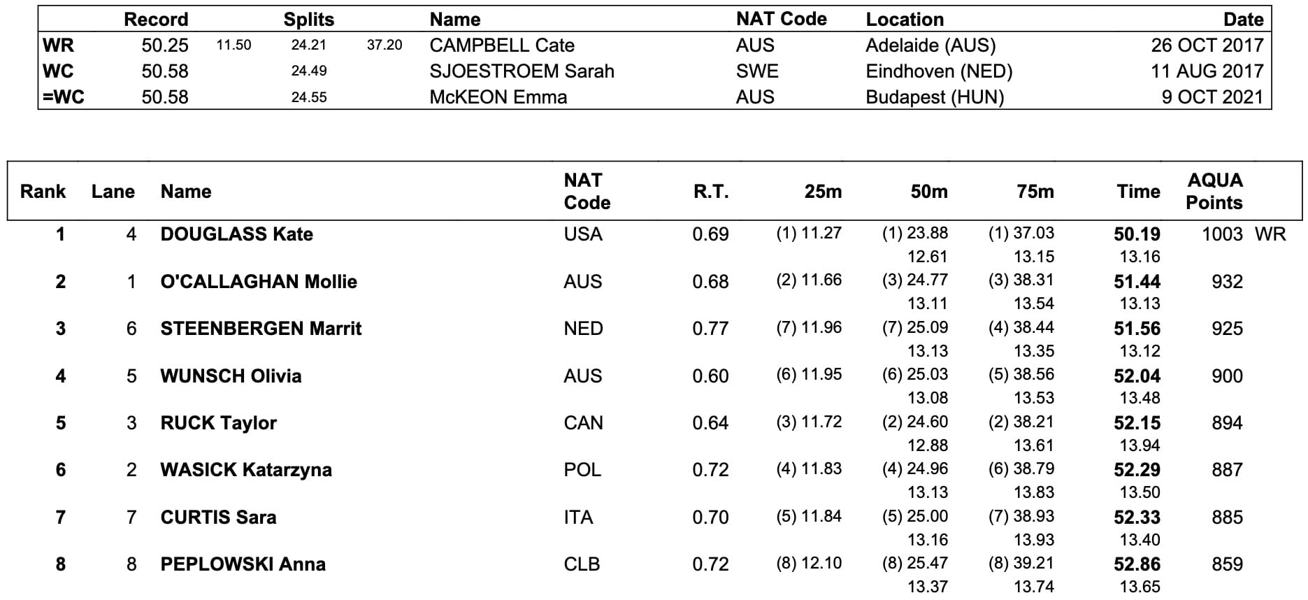 Australia's Mollie O'Callaghan, the Olympic 200m free champion who yesterday became the first woman ever to race inside 1:50sec over 200m free, was closest, on 51.44, after having turned almost half a second down on the Douglass after just 25m, the bronze to Dutch ace Marrit Steenbergen in 51.56, Australia No1 Olivia Wunsch on 52.04: