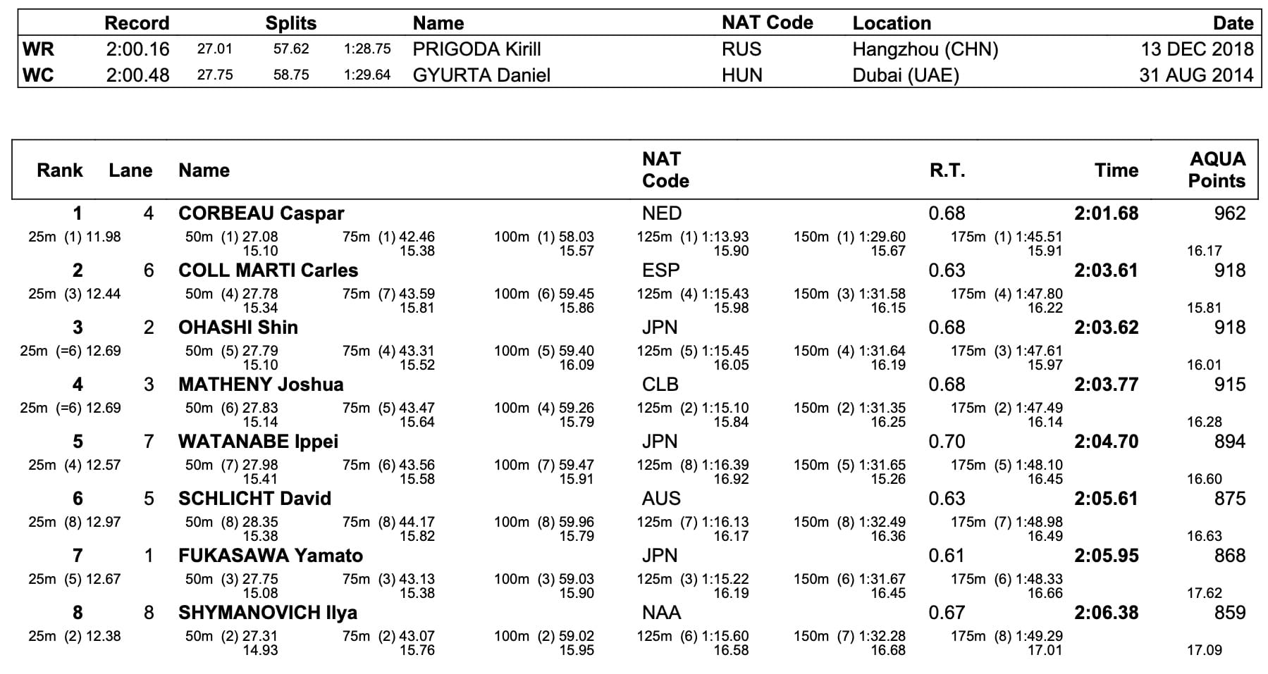 The other 950-points plus win among men on the day was Caspar Corbeau's dominant 2:01.68 in the 200m breaststroke, the Dutch ace piling on the speedy swims on this tour. Spain's Carles Coll clocked 2:03.61 for second 0.01sec ahead of Japan's Shin Ohashi. Also worth a line: After a much speedier 100m and another solid 50m swim, Adam Peaty (GBR) just missed the 200m final, in 2:06.