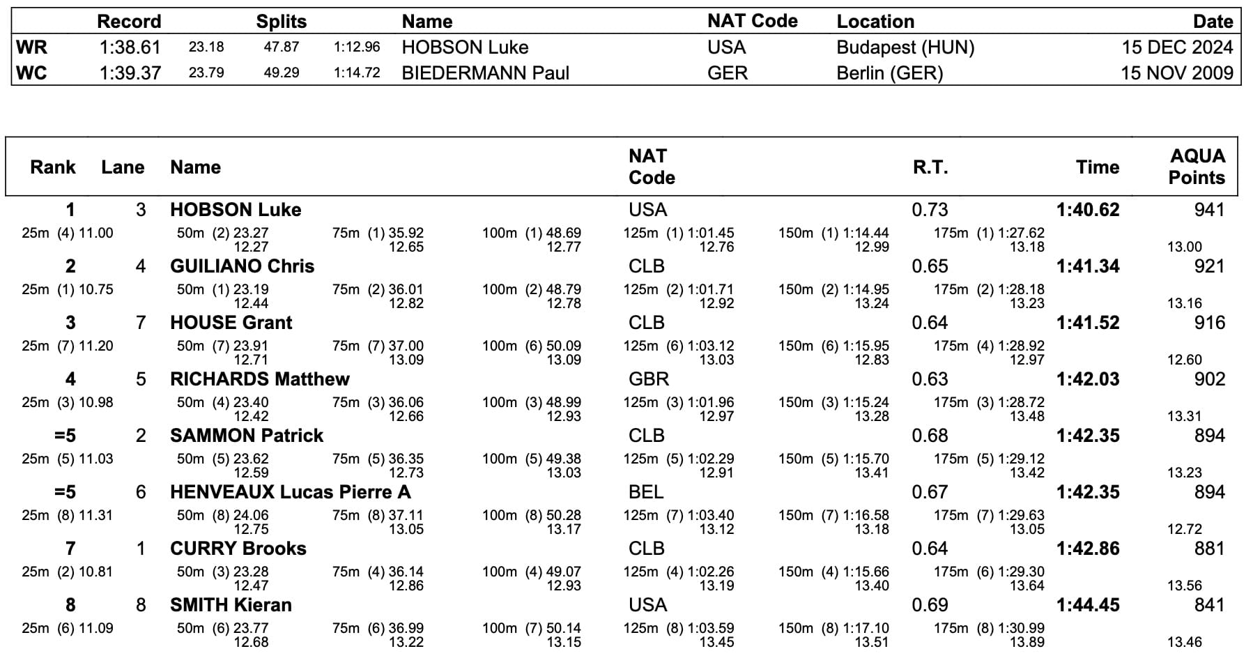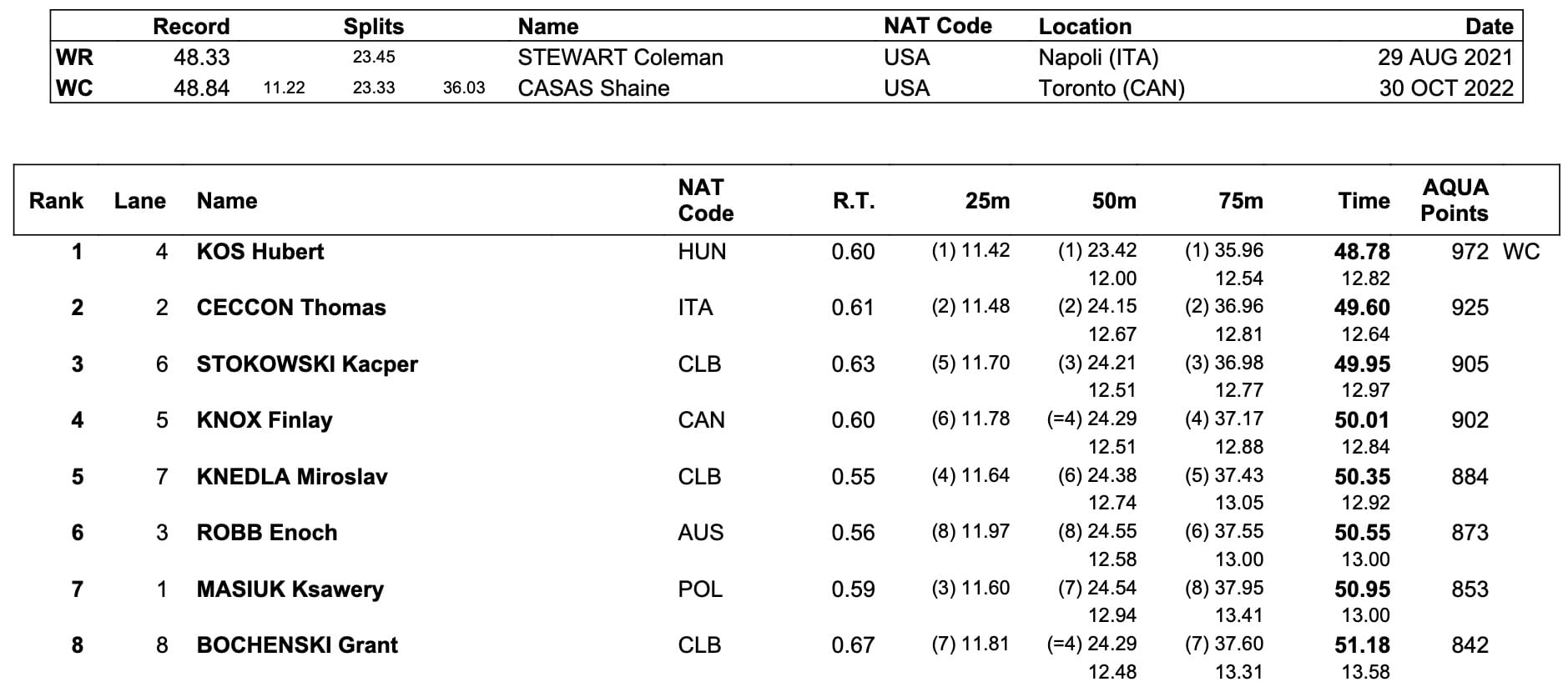 Hubert Kos produced the sole men's World Cup record on the last day in Westmont, the Hungarian's 48.78 - 5th fastest all-time - out-reaching the standard that has been held at 48.84 by his now Texas Longhorns teammate Shaine Casas since 2022: