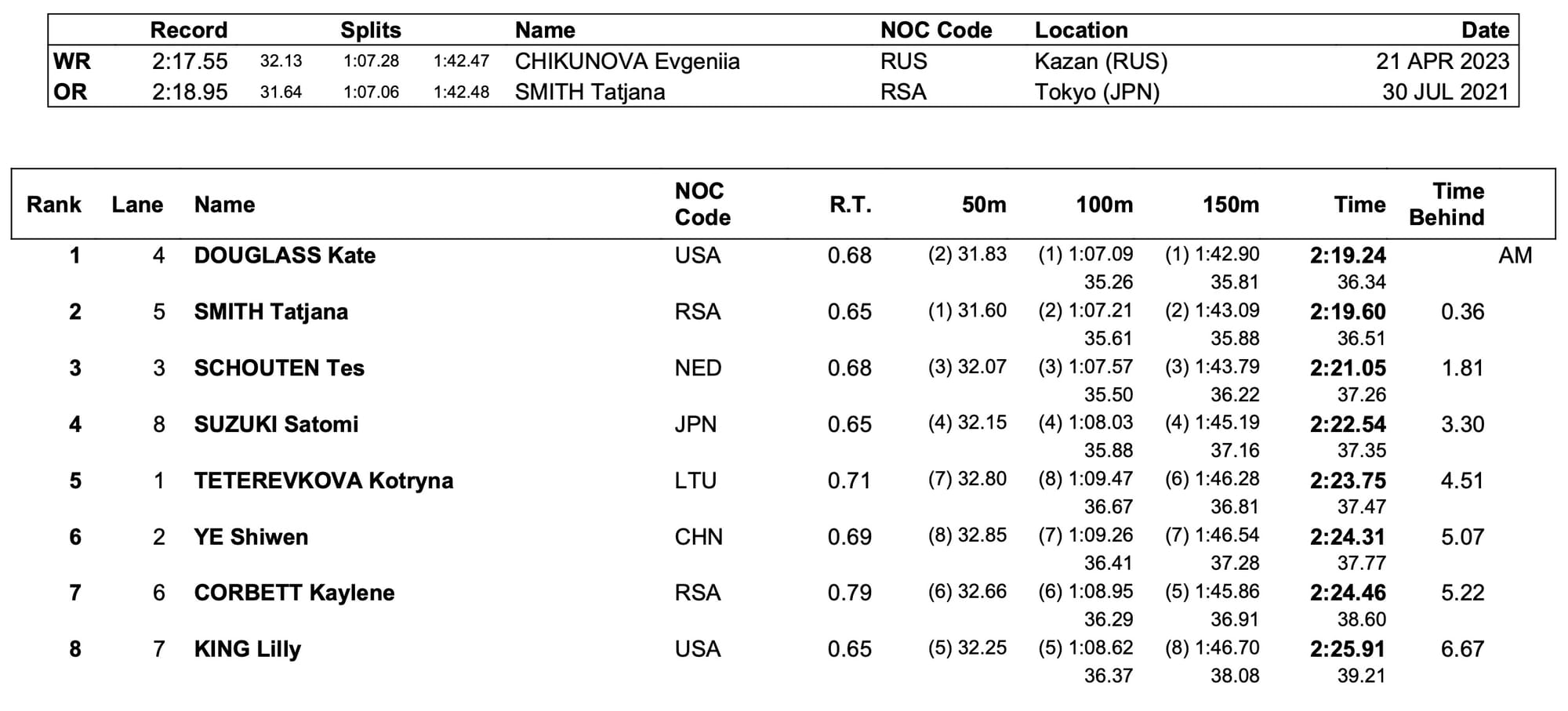 Smith, 100 breaststroke champion here in Paris this week, came so close yet so far to keeping the big prize but it Wass not to be. Silver was her's in 2:19.60, the bronze to Tes Schouten, of the Netherlands, in 2:21.05.