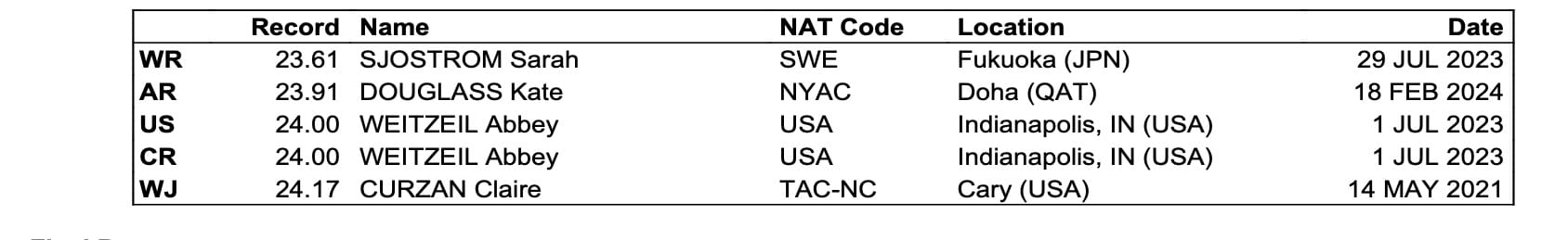Terrific as those two sub-24s are - the second time in history that two sprinters in domestic waters have raced below 24 in the same final, after Australians Emma McKeown and Cate Campbell pioneered it in 2021 - and fine as that 24.04 is as it delivered a U.S. podium the world-ranks top 3 for 2025, here's the drop: Sarah Sjöström, Sweden's Paris 2024 double sprint freestyle champion, has matched that 23.91 five times and has the bettered the mark a further 21 times.