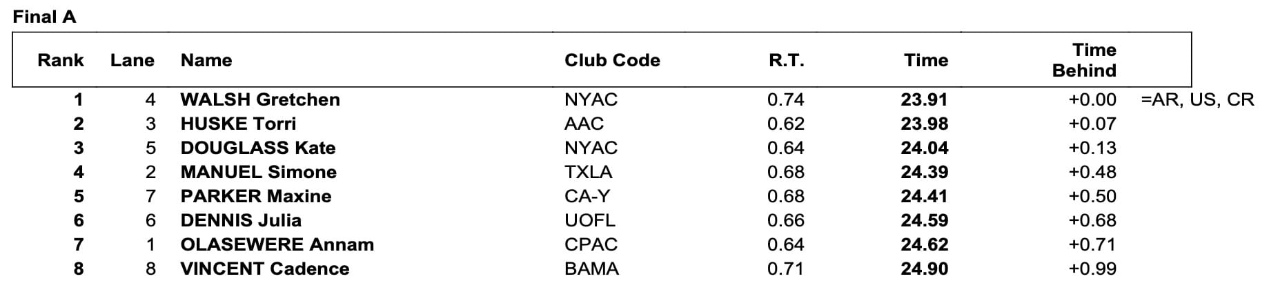 Walsh 23.91, Huske 23.98, Douglass 24.04 Deliver Dashing End To U.S. Nationals