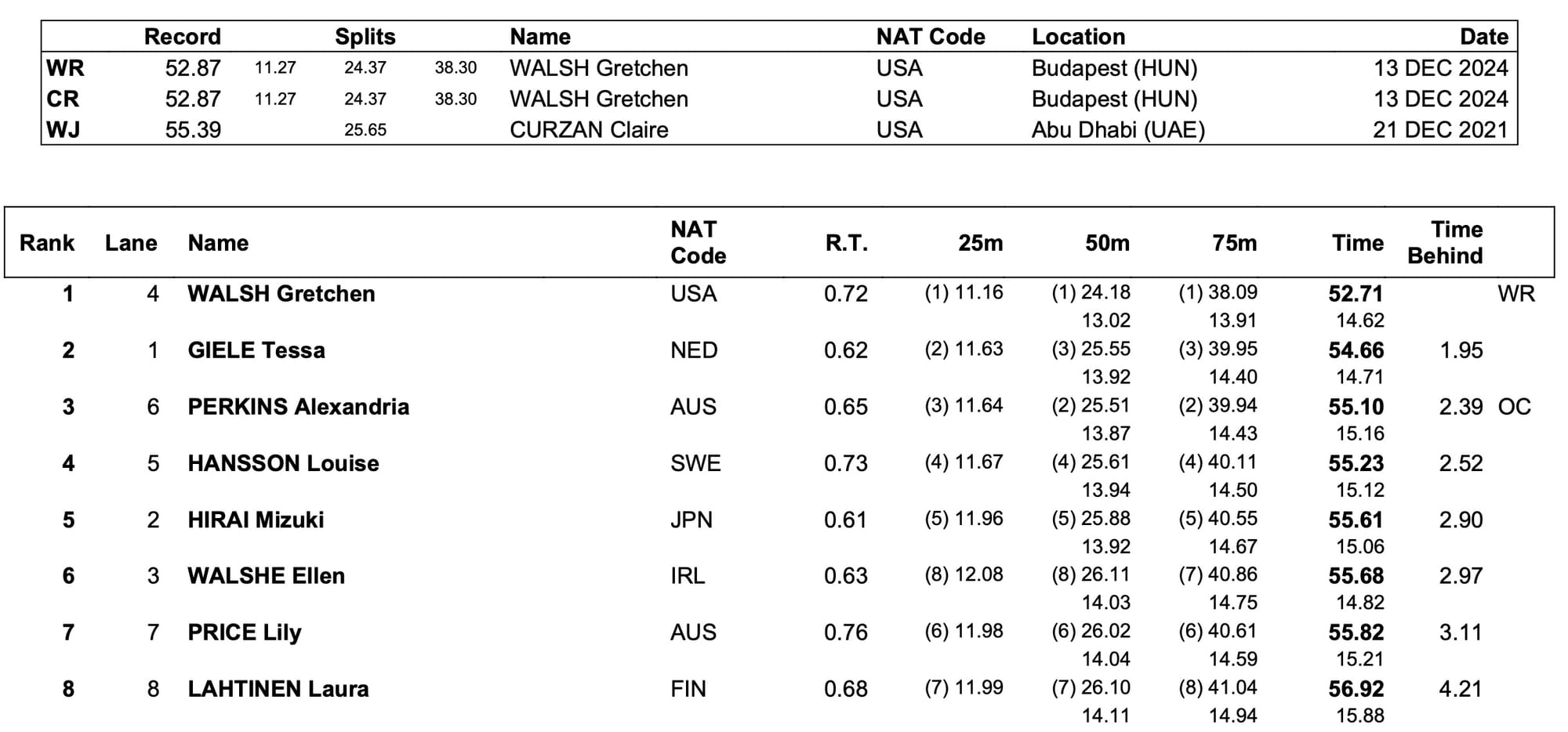 The previous record for individual world records at a single competition was held by Michael Phelps, in the more challenging environment of a World Long-Course Championships, at Barcelona 2003. An amazing count for Walsh, her achievement in the little pool truly outstanding (but not comparable with events such as Olympic Games - far fewer events - nor even World l/c, where the cauldron is all the hotter).