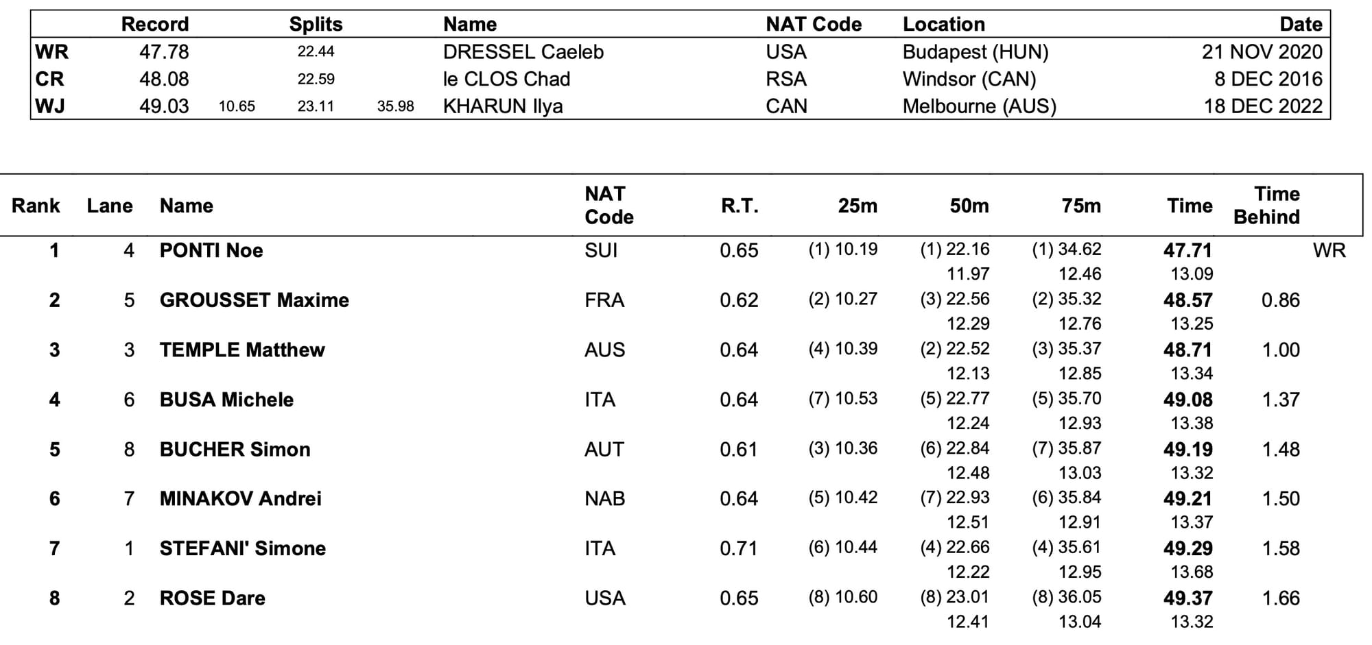 Though his 'fly dash was breathtaking, Ponti's latest punchy pace, perhaps, marks the most impressive of the 2020ne Olympic bronze medallists' three triumphs. Consider the 47.78 of Caeleb Dressel hurtling towards the height of his powers at a delayed Tokyo Olympics. Ponti went 0.07sec faster, in 47.71.