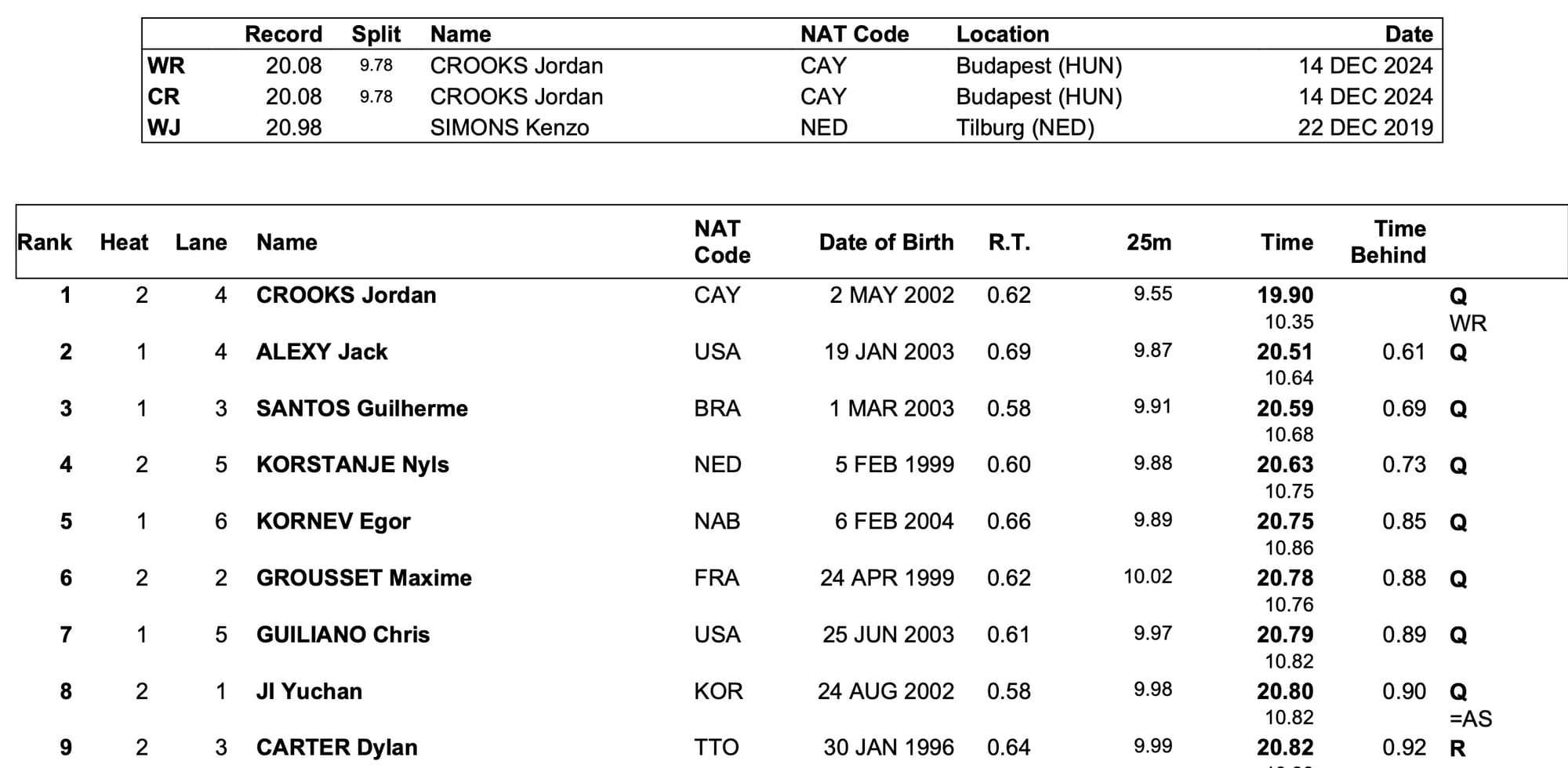 The form guide and results of the semis says it all, Jordan Crooks of the Cayman Islands celebrating two World records in a day, on 20.08 and then a shattering, clattering 19.90 semi that placed the first sub-20 in the books.