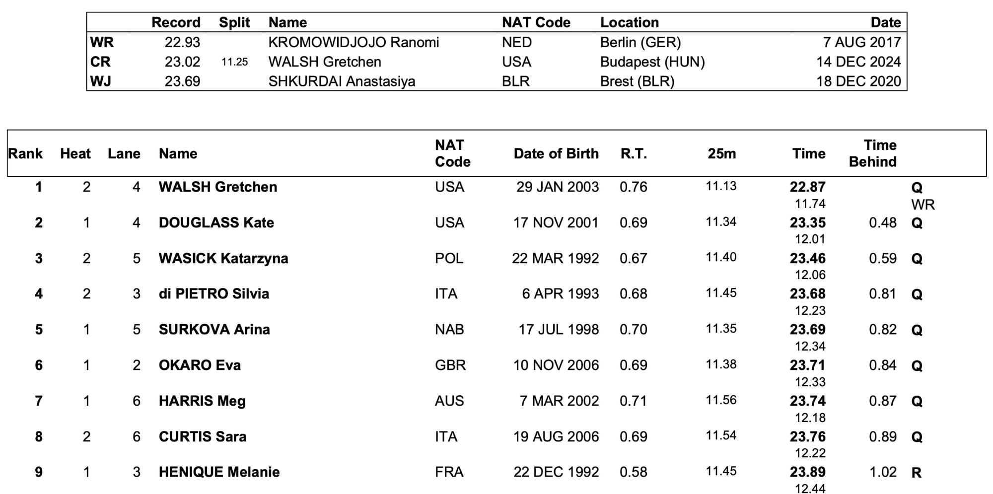 Not for the first time this week, she then kept the motor running and after a quick turnaround took down the World record in her semi of the 50m free, a 22.87 confining to history the 22.93 of Dutch double Olympic sprint champion of 2012, Ranomi Kromowidjojo, back in 2017.