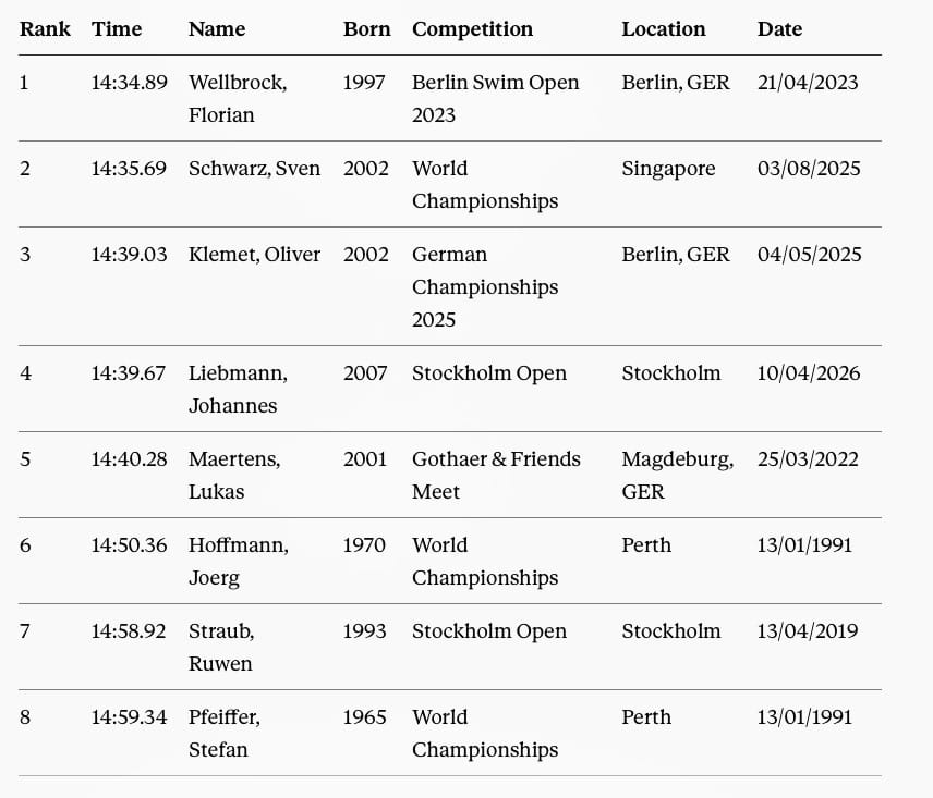 And here's the all-time club of German sub-15min swimmers: