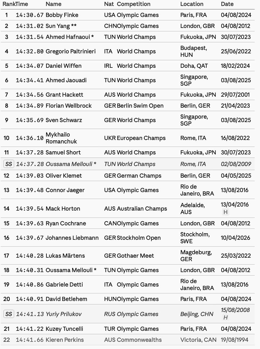 On our rankings below, showing the best times of each swimmer, Liebmann's swim demotes Perkins's 1994 World record, an ahead-of-time 14:41, to No22 on the all-time top 20 (textile; shiny suits swims noted, with Oussama Mellouli's shiny suit and textile best times in the table):