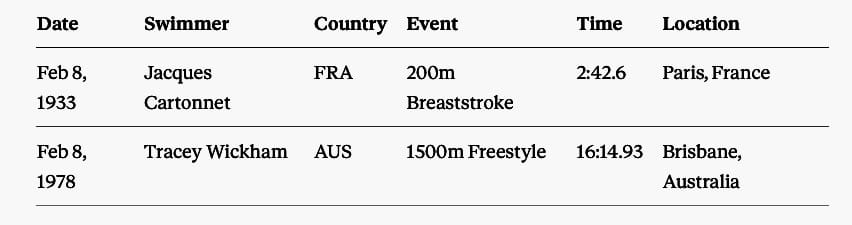 Her 400m and 800m freestyle world records set in 1978 each stood for almost 10 years. When her records were broken by the next trailblazer on the clock, Janet Evans, USA, they were the longest standing records in swimming at the time.