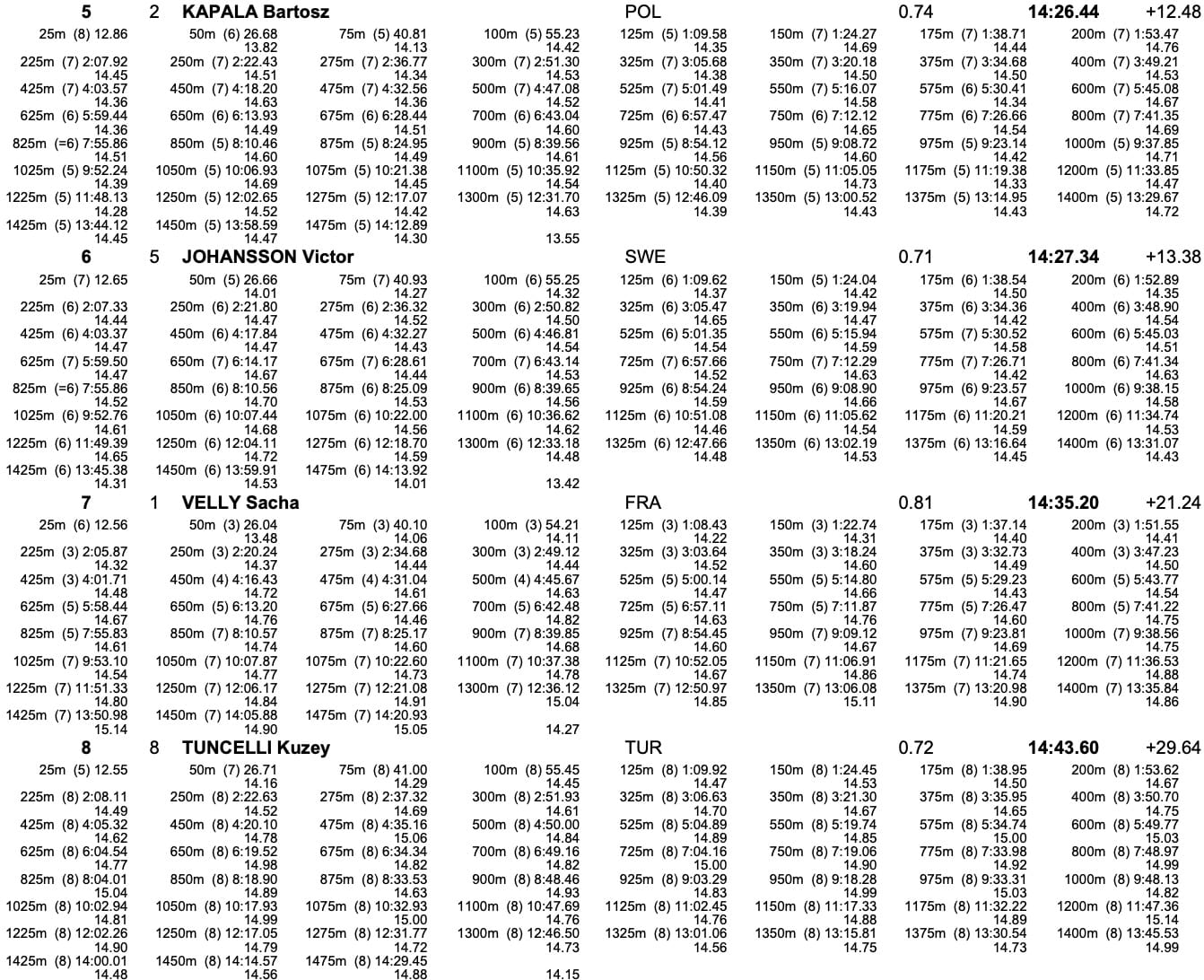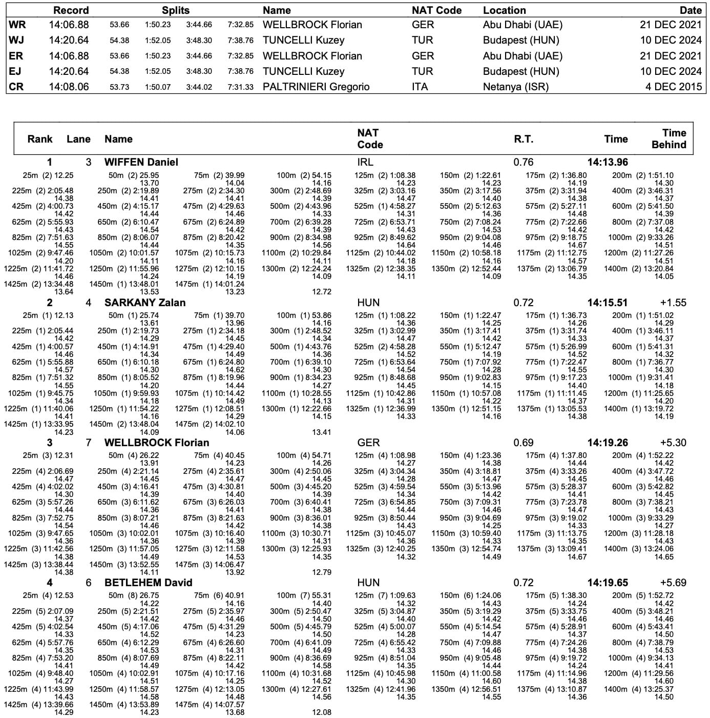 The splits tell the cat-and-mouse tale of a race for the title that ended 14:13.96 to 14:15.51 in Wiffen's favour. The battle for bronze went to Tokyo 2020ne Olympic bronze medallist over 1500m, Germany's Florian Wellbrock, who claimed marathon gold at the same Games. Hungary's second contender, David Betlehem fell 0.39sec shy of the podium: