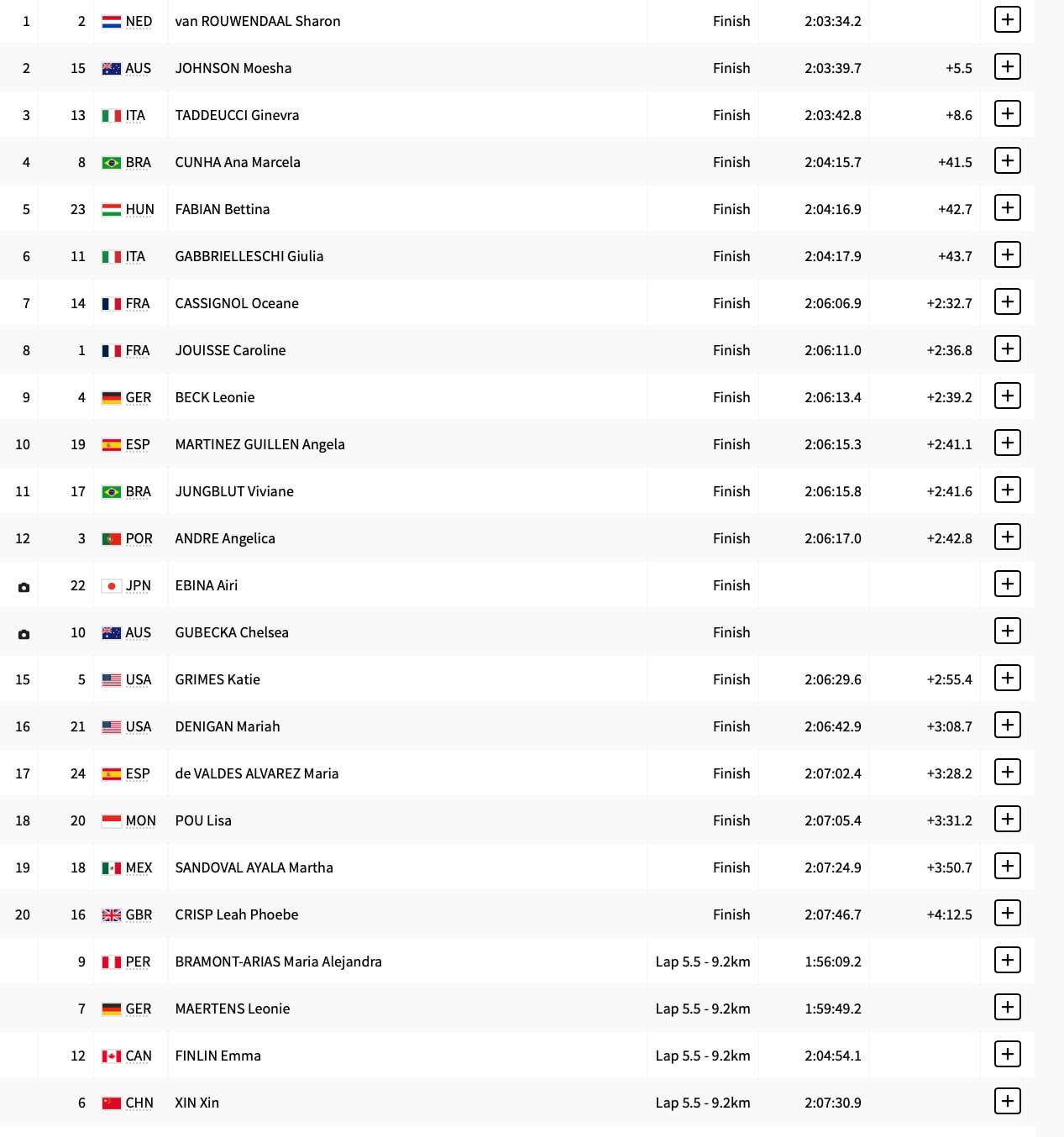 Live coverage below for SOS+ members ... after four laps, both champions of 2016, Sharon Van Rouwendaal (NED), and 2021, Ana Cunha (BRA), remain in the top 5. No swimmer has ever won two golds in the marathon since its introduction in 2008. The long-term leader after four laps: Moesha Johnson, of Australia and based in Germany, her teammate Chelsea Gubecka also in the top 5.