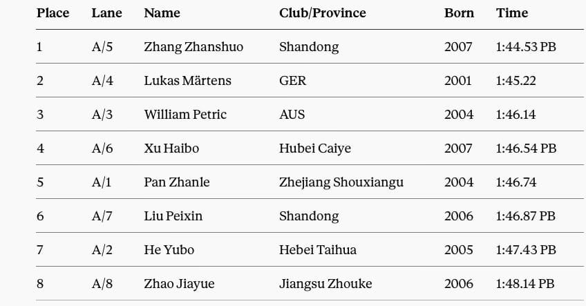 Zhang also leapfrogged Olympic 100m champion Pan Zhanle (1:44.65, 2023) for the China all-time No2 spot in the 200m free as he took the race today ahead of Märtens 1:45.22 for second. Australia's William Petric took third in 1:46.14 in a final that saw four other Chinese swimmers in their early twenties clock personal best times: